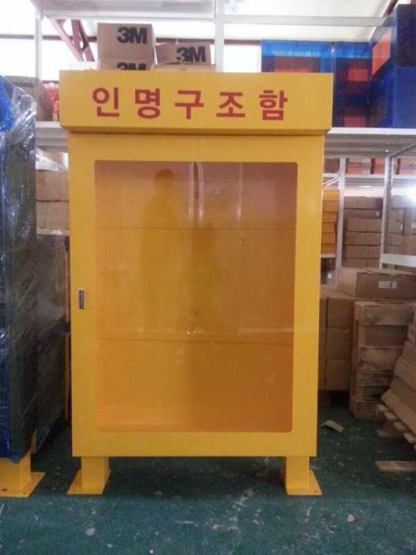 1. 품명 : 해상 인명구조함 2. 모델 : JI-LS15 3. 재질 : Steel 1.2T 노란색 분체도장 4. 규격 : 1000*300*1500 5. 사용장소 : 해수욕장, 수영장, 선착장 등 익사사고가 빈번한 장소 6. 기타사양 1) 지붕형 채택 : 1000*400*200(규격에 포함) 2) 다리길이 200, 앙카 고정 3) 내부 용품걸이 설치